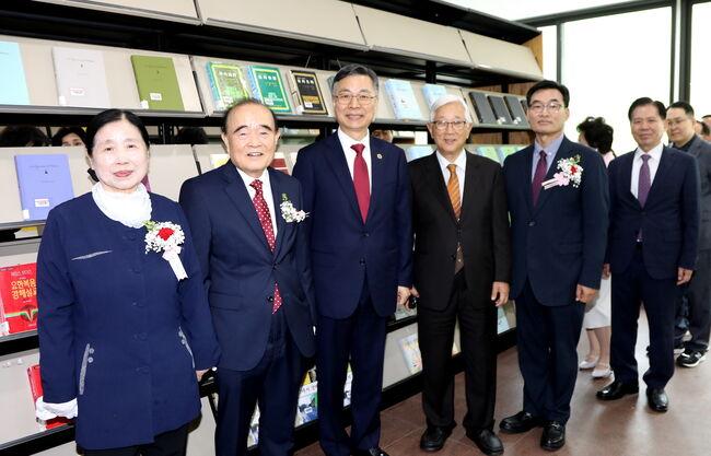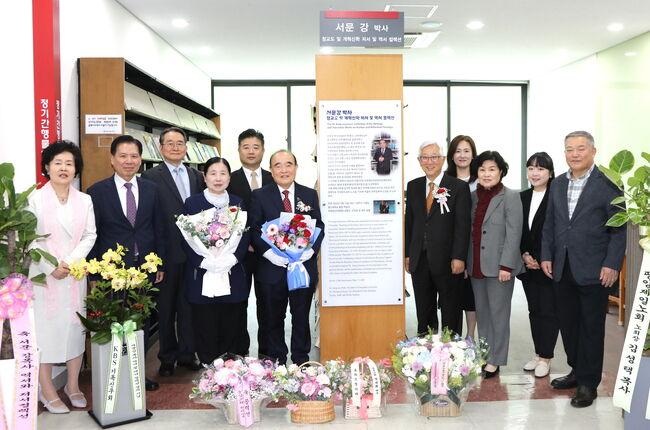 현판에 새겨진 기념 문구를 낭독한 후에 기념식에 참석한 모든 가족 친지들과의 기념사진을 찍는 순서에 이어 서문 강 박사의 저서 및 역서가 진열된 도서관 진열대를 함께 관람하면서 서문 강 박사 내외의 수고를 다시 한번 격려하고 위로하며 하나님의 은혜에 감사하는 순서를 가졌다.