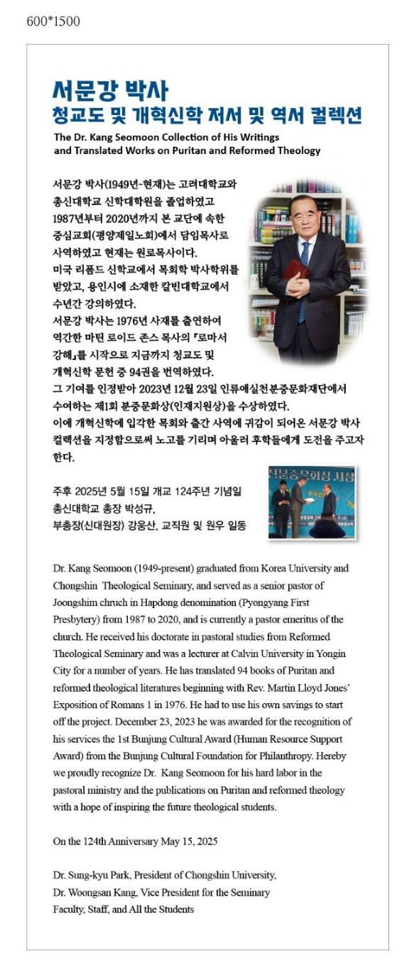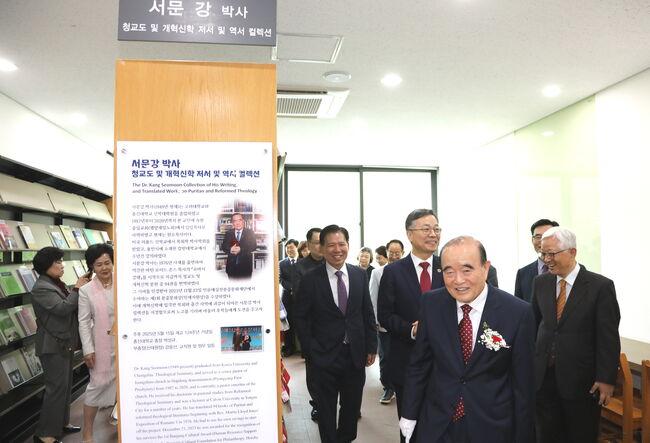 총신대학교 신학대학원(총장:박성규 목사)은 개교 124주년을 맞이하며 서문 강 박사의 저서 및 역서 100여권을 총신대학원 교내 도서관 3층에 진열하는 특별 공간을 마련하였다. 청교도 및 개혁신학의 보급을 위해 50년 가까이 책을 펼쳐온 서문 강 박사의 노고를 기념하는 뜻깊은 행사를 가졌다.