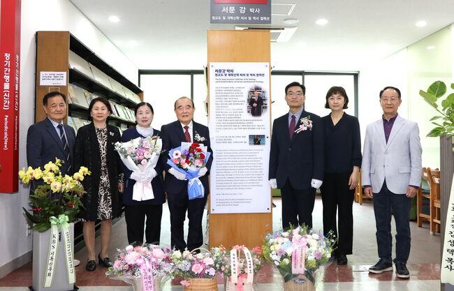 현판에 새겨진 기념 문구를 낭독한 후에 기념식에 참석한 모든 가족 친지들과의 기념사진을 찍는 순서에 이어 서문 강 박사의 저서 및 역서가 진열된 도서관 진열대를 함께 관람하면서 서문 강 박사 내외의 수고를 다시 한번 격려하고 위로하며 하나님의 은혜에 감사하는 순서를 가졌다.